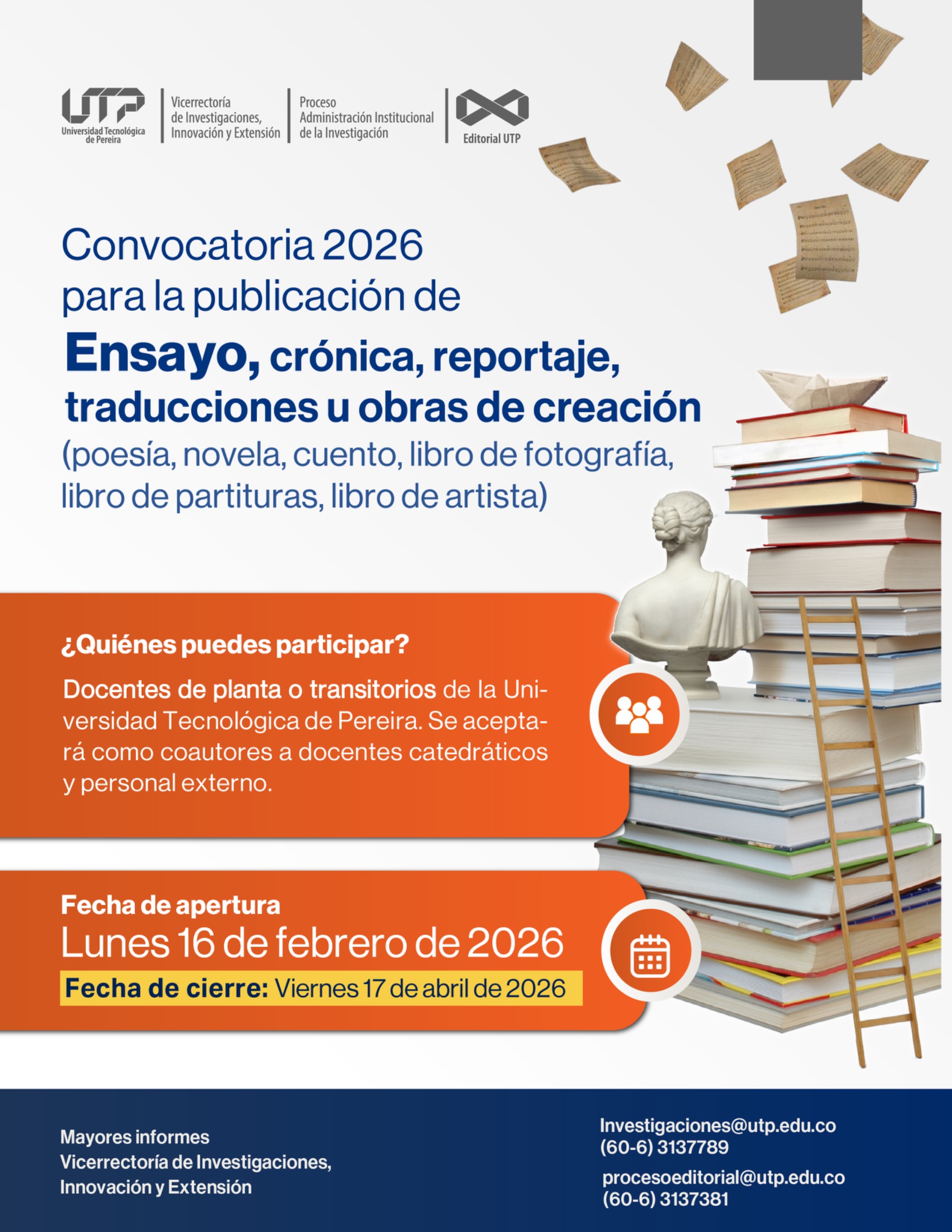 📚✨¡CONVOCATORIA INTERNA PARA FOMENTAR LA PUBLICACIÓN DE LIBROS DE ENSAYO, CRÓNICA, REPORTAJE Y TRADUCCIONES. OBRAS DE CREACIÓN (POESÍA, NOVELA, CUENTO, LIBRO DE FOTOGRAFÍA, LIBRO DE PARTITURAS, LIBRO DE ARTISTA) AÑO 2026!📚✨
