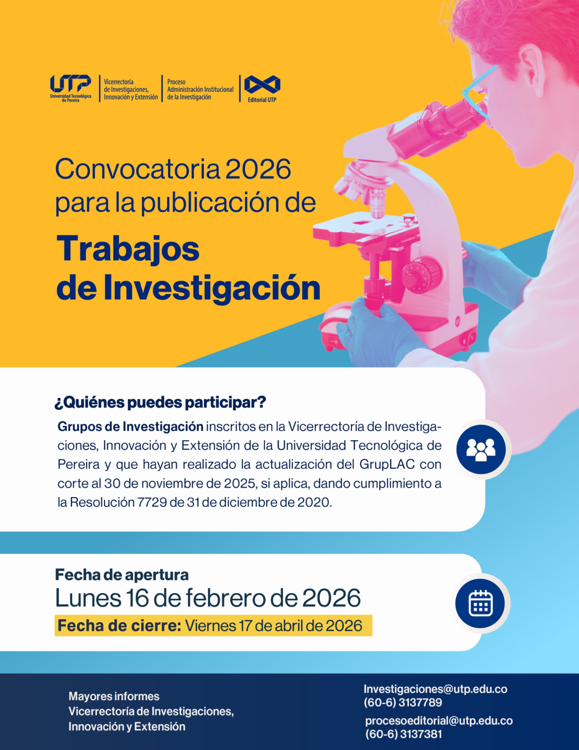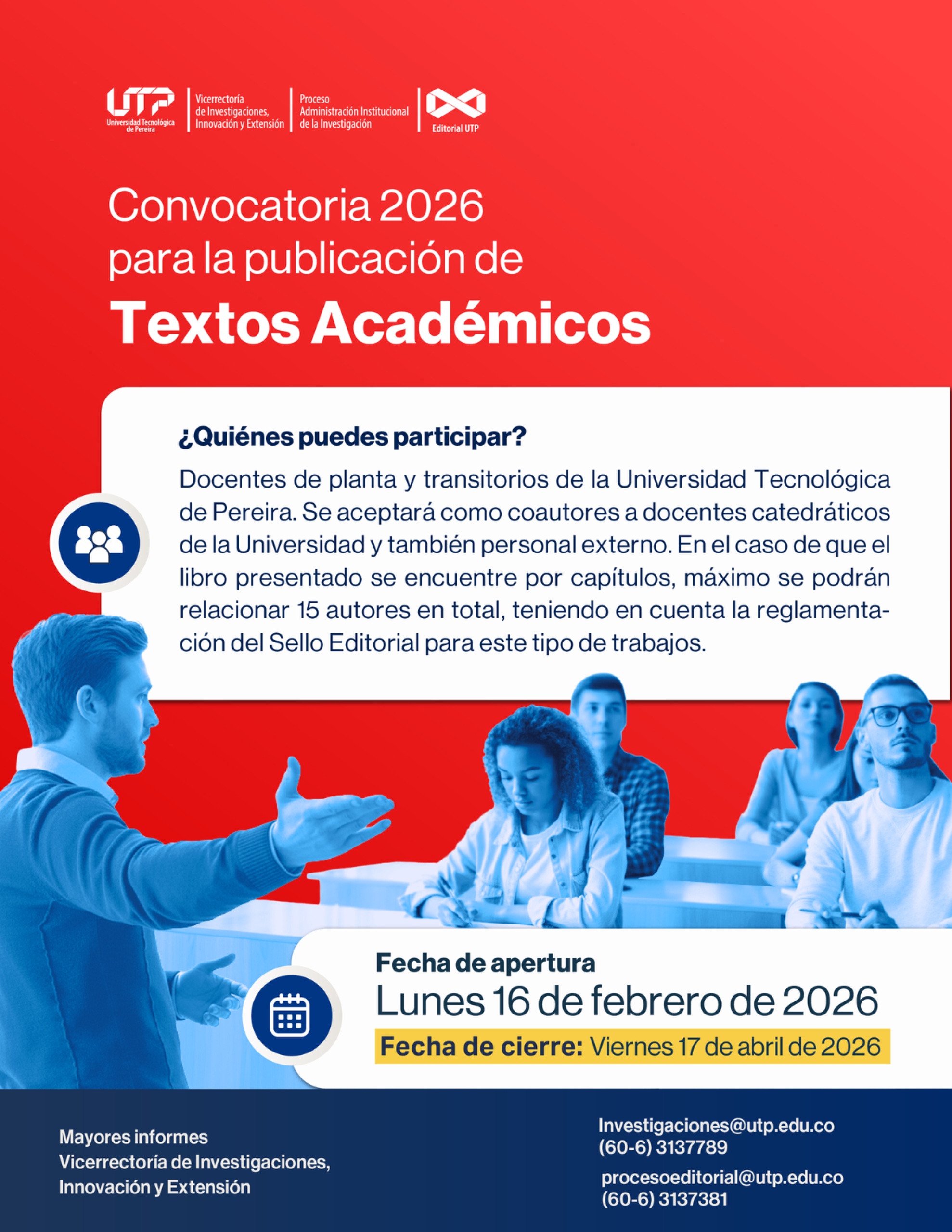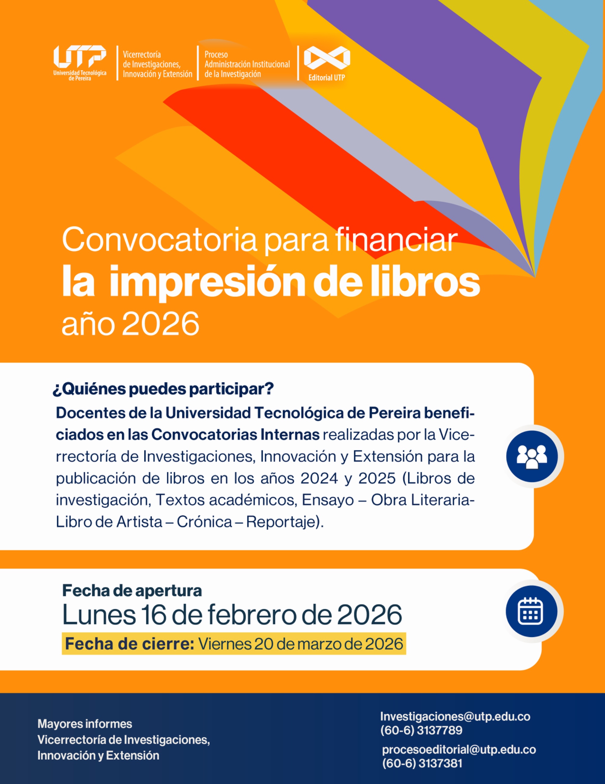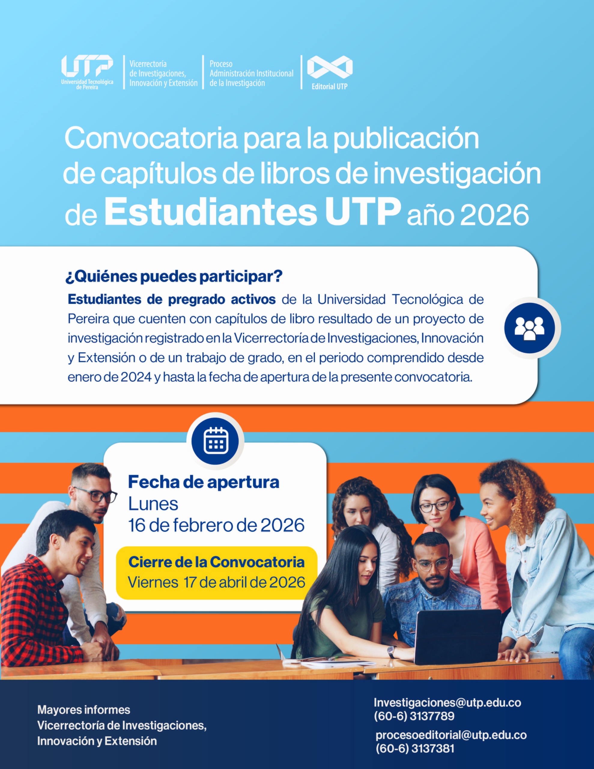 📚✨¡CONVOCATORIA PARA LA PUBLICACIÓN DE CAPÍTULOS DE LIBRO DE INVESTIGACIÓN DE ESTUDIANTES DE PREGRADO UTP AÑO 2026!📚✨
